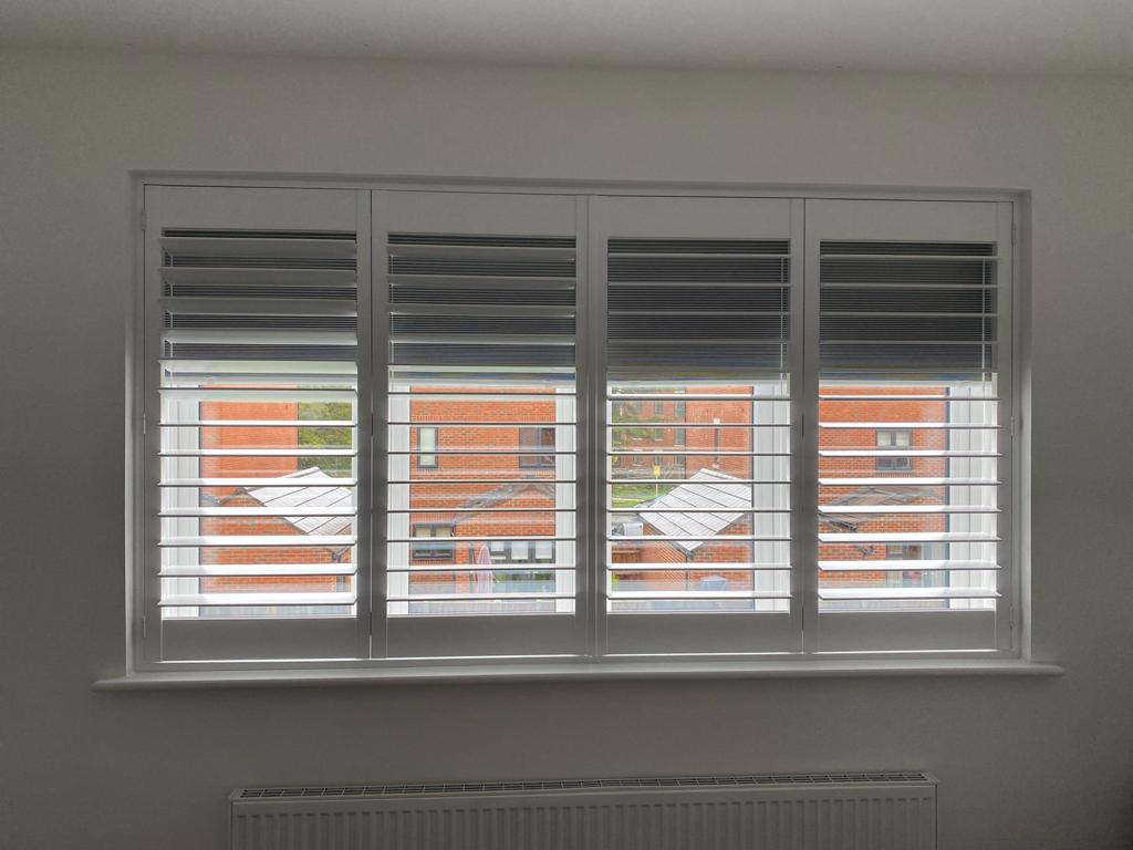 This installation features full height shutters with a split louvre design — offering independent control of top and bottom sections. It’s the ideal solution for maintaining privacy while still letting in natural light. A perfect upgrade for this home office setup.