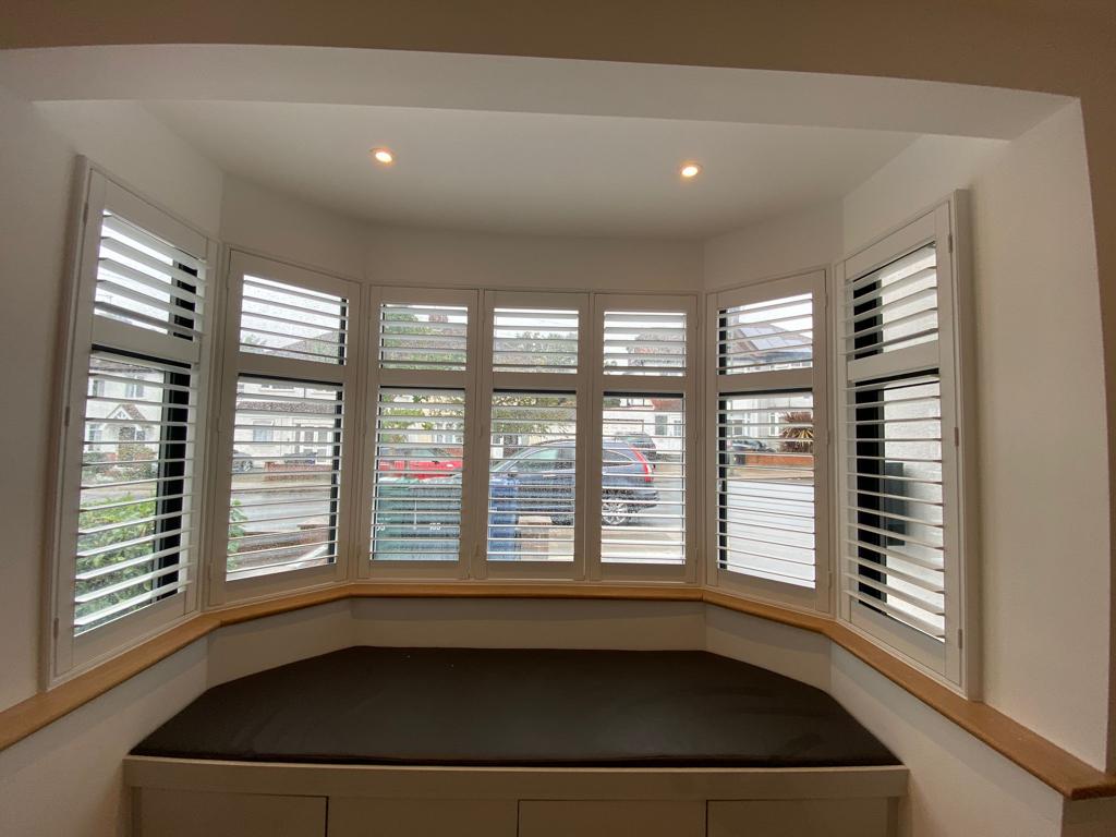This curved bay window received a stunning upgrade with bespoke shutters that follow the window’s natural shape. The new installation improves light control, adds a clean architectural finish, and preserves the functionality of the built-in seating area. A flawless transformation tailored by Shutters Factory.